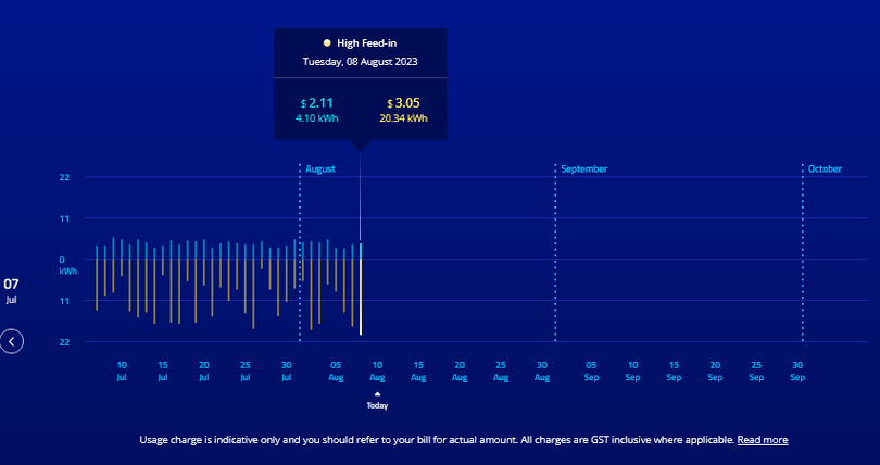 You can see here that I used 4.10 kWh and generated 20.34 kWh, looking at the rest of the graph you can see this is close to my average usage for this billing period.