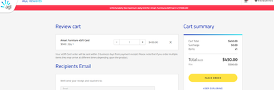 I'm trying to purchase an Amart gift card via AGL Rewards but when I go to checkout, I get a red error message saying, "Unfortunately, the maximum daily limit for Amart Furniture eGift card is $1000"