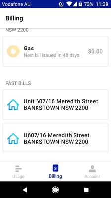 Looks like the issue is that the two bills are being treated as separate properties by the app. This is because they have different address formats - one is U607 while the other is 607. A quick fix for this would be to contact customer service and have them update the addresses to match - although of course ideally the app should be able to recognize them as the same place.