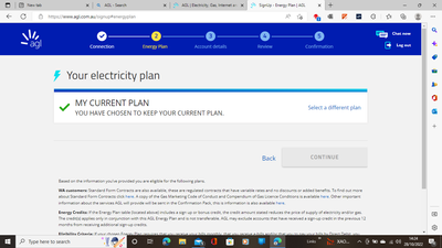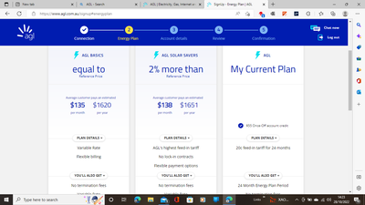 repeated discussions with AGL including their complaints dept they are making us worse off by $10 per week because of their incompetence in getting their explanations to us. Because we are on the Gov feed in we have lost 10c yet they are offering it to others for 54c feed in. I looked at the site and in this it has stay on your old plan and I have clicked and have the screenshots to say we can have it for 24 months yet the complaints dept today prior told me I cannot have that. Anyone wanting the screen shots please contact us.