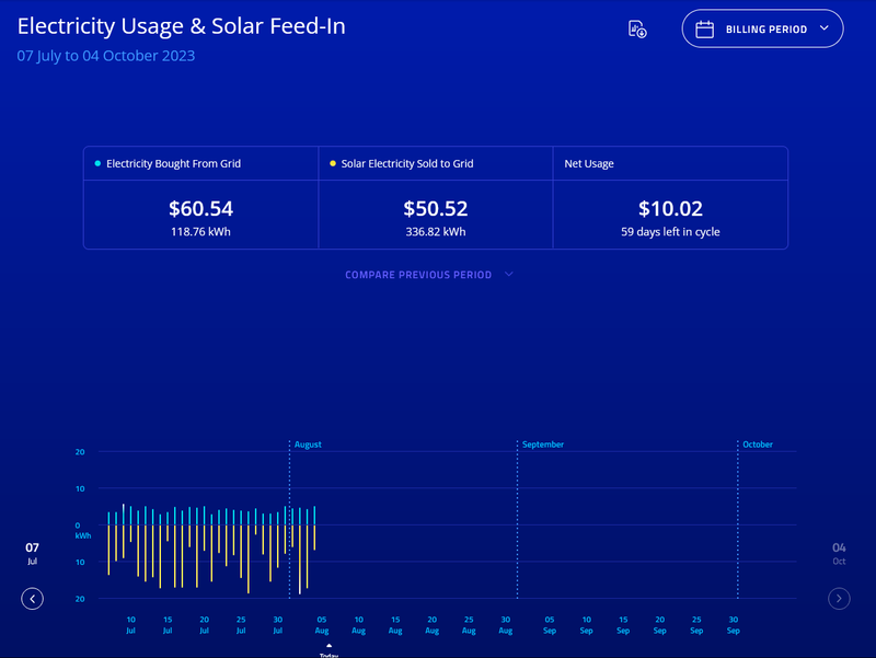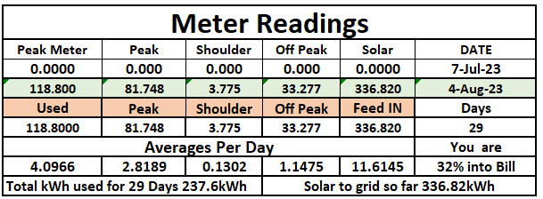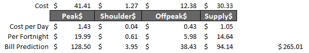 Here is the costings for my next bill so far (29 days) the $265 on the right is the amount I would have to pay if I had no solar. However this is not really correct because it includes the solar that I used out of my generation.