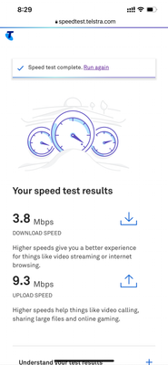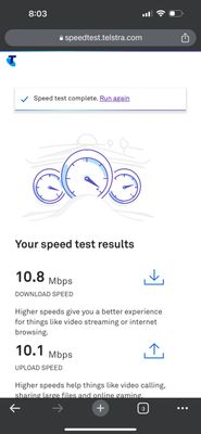 https://speedtest.telstra.com/  states 49Mbps and 13Mbps
