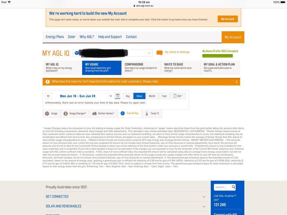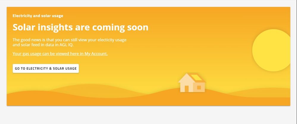 When I try to track my energy usage via the website, (not the app, the app works fine) I receive a message stating "Solar insights are coming soon". There is another option to choose "Go to energy & solar usage" but this takes me AGL IQ which only allows me to see my GAS usage.