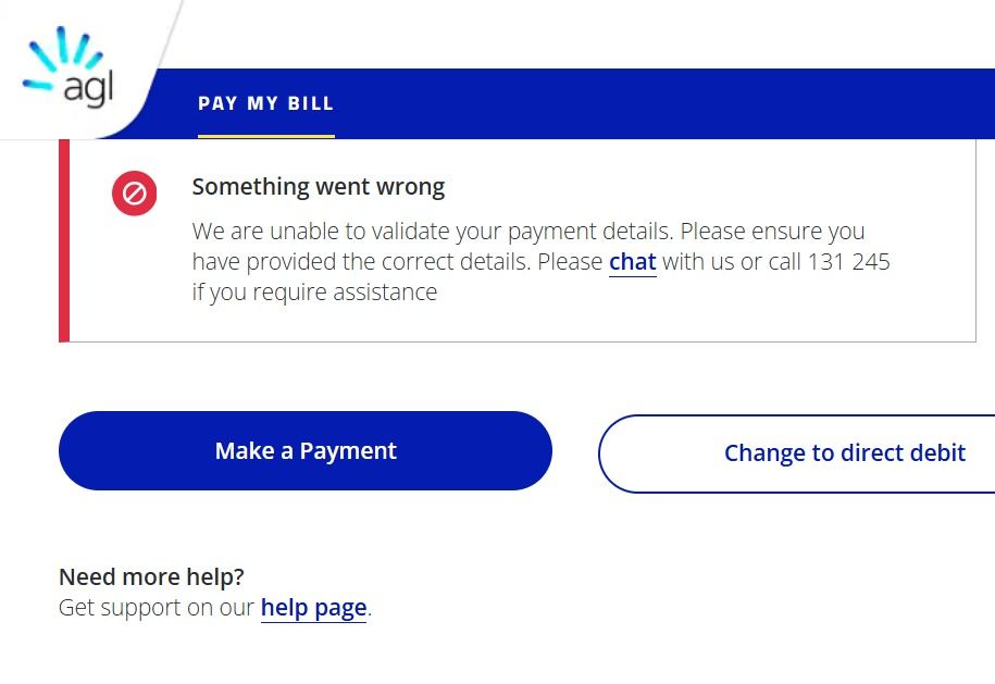 been trying to pay this bill from October but still can't, now overdue charg also added. Um really disapointed. I complained about this issue several times to AGL support team. Still no solution