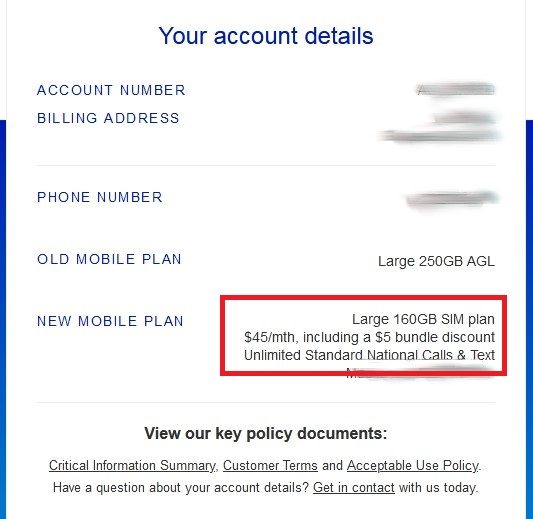 So I've just changed my AGL plan, to the 160Gb large. As an existing AGL mobile and energy customer, I understand I don't receive the new customer 6 month discount, but should still get the bundle discount, making the plan $40 per month. I have just received the "Welcome" email, and it shows the cost as being $45 per month, only a $5 bundle discount. What's going on? Was I just not supposed to notice the discrepancy? Thanks.