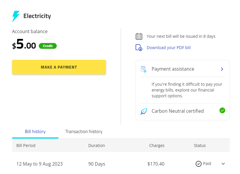 My Web account in the bill section doesn't show me if bill is paid or not which I would have liked to see as have paid early as going away and would be good if it said PAID