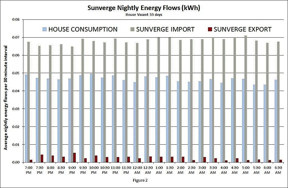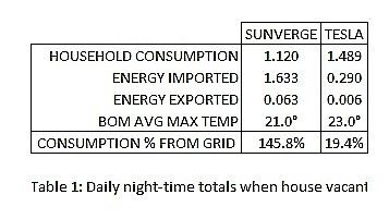 In SUNVERGE VS TESLA HOUSE VACANT NIGHT-TIME ENERGY FLOW ANALYSIS, I graphically demonstrate the stark differences between the Sunverge and Tesla systems on an half hourly basis between the hours of 6:30 pm and 7:00 am, and when the house was vacant and running only a refrigerator.