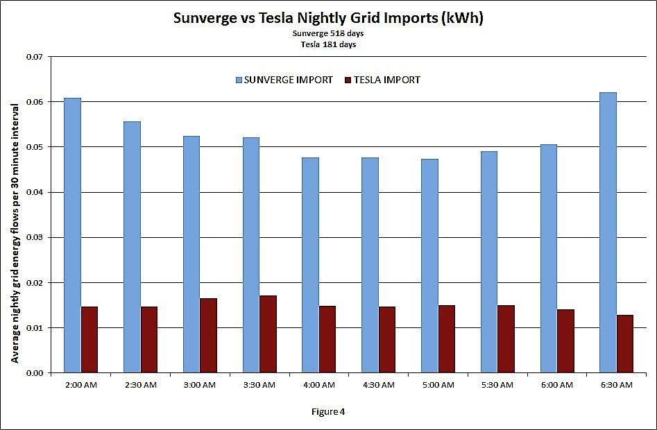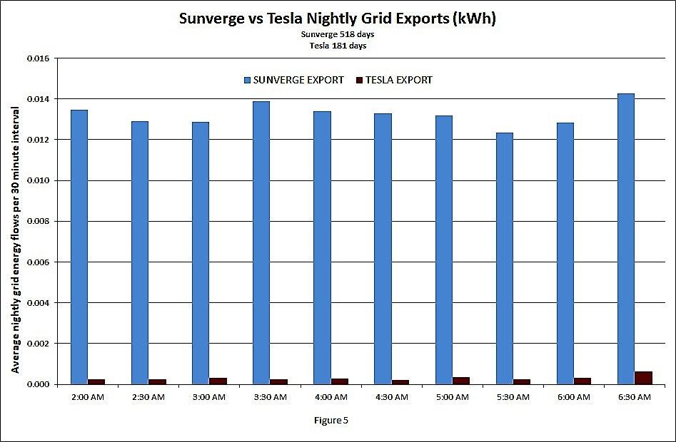 In SUNVERGE VS TESLA NIGHT-TIME GRID IMPORT AND EXPORT ANALYSIS, I graphically show the differences over the current lifetime of both battery systems with regard to the grid energy imported and exported between the hours of 2:00 am and 7:00 am.
