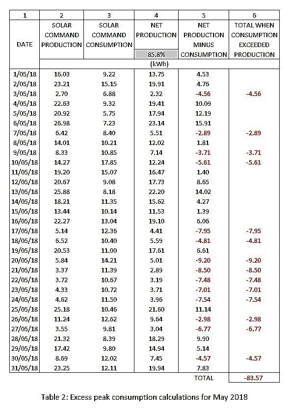 Column 4 shows the monthly totals as derived in Column 6 of Table 2. Column 6 shows the excess energy imported, being the metered and billed imported energy minus the energy we actually needed from Column 4. Column 7 is the cost of the values in Column 6 at the prevailing discounted tariff for that month.