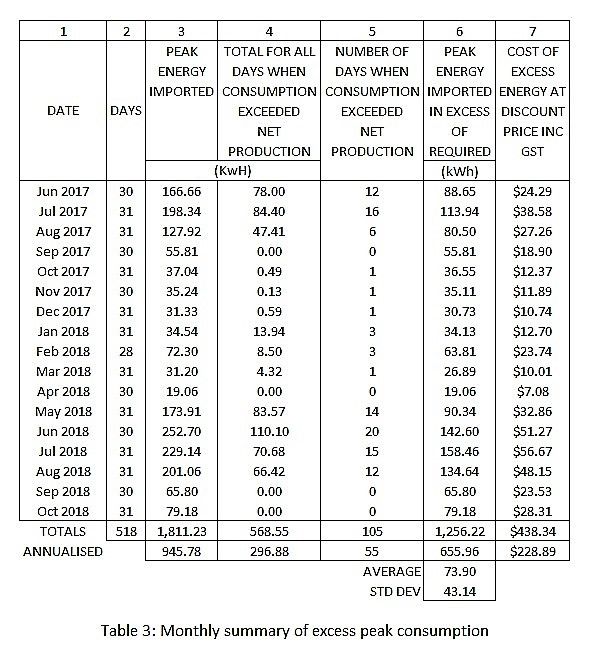 This analysis shows that we paid an extra $438.34 in total over 518 days at then existing tariffs, or $449.21 on current tariffs. Of the total of 1,811 kWh of peak energy imported, 1,256 kWh, or 69%, were excess to requirements. The month by month repeatability of this excess importation of grid energy shows that this problem persisted for the life of the Sunverge system from initial installation until final replacement.