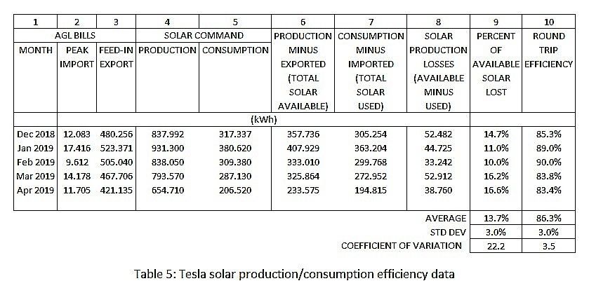 Table 2 below illustrates this process for May 2018. Columns 2 and 3 are taken from Solar Command csv data. Column 4 is net solar production using the Tesla round turn efficiency of 85.8%. I haven’t used the round turn efficiency of the Sunverge battery because of the fact that it imported so much excess grid energy, and its value is therefore not meaningful for the purposes of converting Solar Commands gross production to net production. I have used net production to provide a more accurate real-world analysis, allowing for the losses inherent in converting solar production to energy usable in the house.