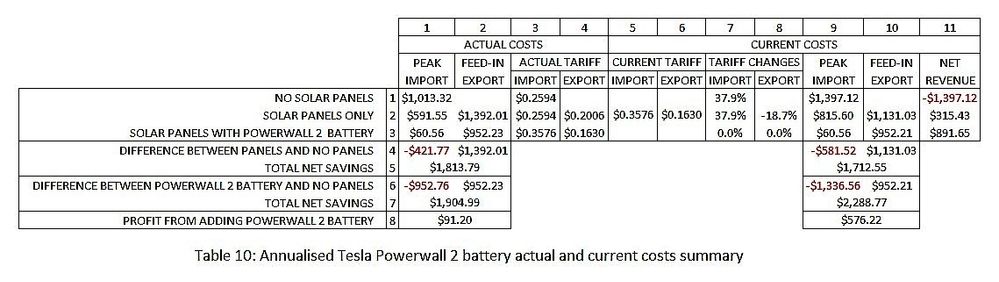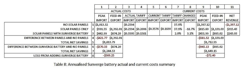 The loss shown in Row 8 for Columns 1 and 2, as compared to Columns 9 and 10, is a result of much lower import tariffs and much higher export tariffs for the period when we had panels only, compared to the period when we had the Sunverge battery as well, as clearly detailed in Tables 6 and 7.
