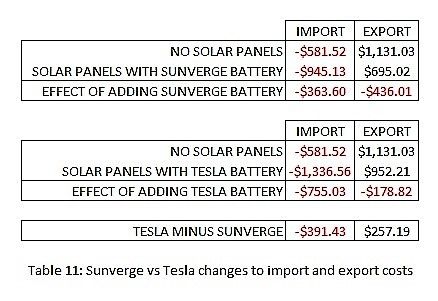 Adding the greater grid import savings of the Tesla to the greater grid export revenue of the Tesla leads to a significant benefit of Tesla over Sunverge of $391.43 + $257.19 = $648.62 per annum. This is the same figure, of course, as adding the loss per annum for Sunverge (Table 😎 of $72.40 to the profit per annum for Tesla (Table 10) of $576.22.